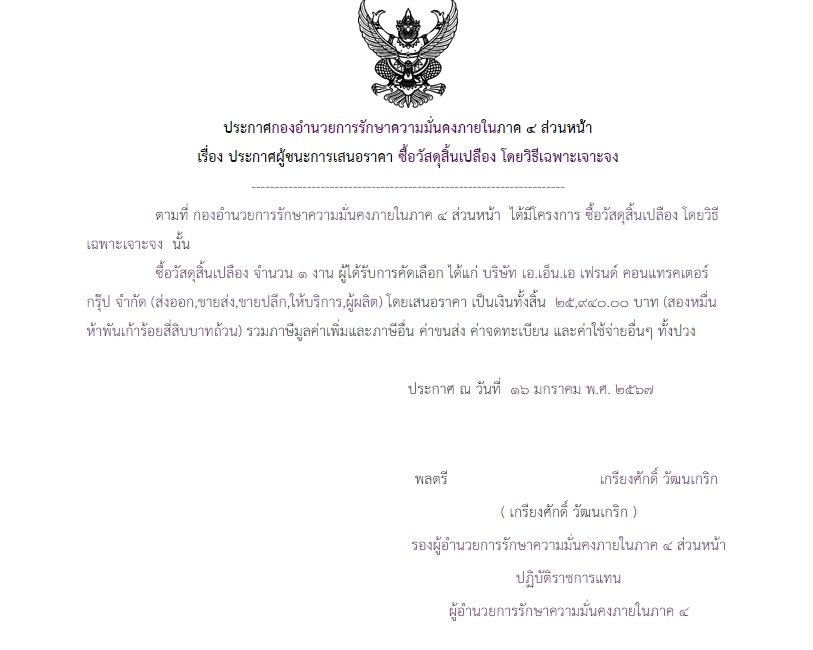 ประกาศผู้ชนะการเสนอราคา ซื้อวัสดุสิ้นเปลือง โดยวิธีเฉพาะเจาะจง