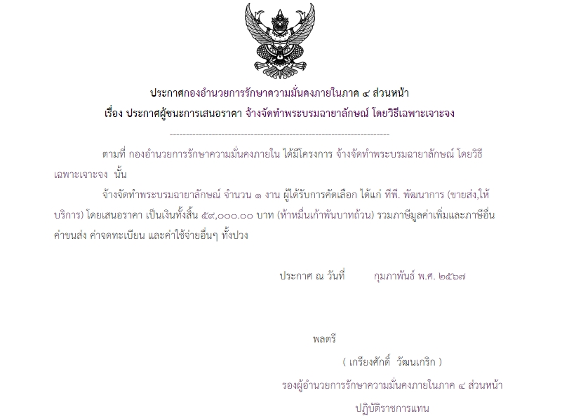 ประกาศผู้ชนะการเสนอราคา จ้างจัดทำพระบรมฉายาลักษณ์ โดยวิธีเฉพาะเจาะจง