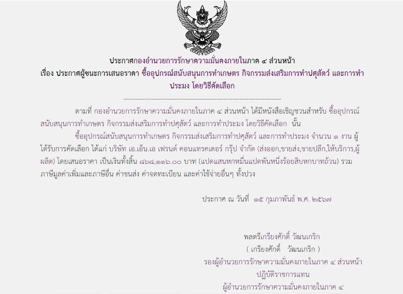 จัดซื้อ จัดจ้างประกาศผู้ชนะการเสนอราคา ประกาศผู้ชนะการเสนอราคา ซื้ออุปกรณ์สนับสนุนการทำการเกษตร กิจกรรมส่งเสริมการทำปศุสัตว์ และการทำประมง โดยวิธีคัดเลือก February 15, 2024 330 Share Facebook Twitter Google+ Telegram LINE