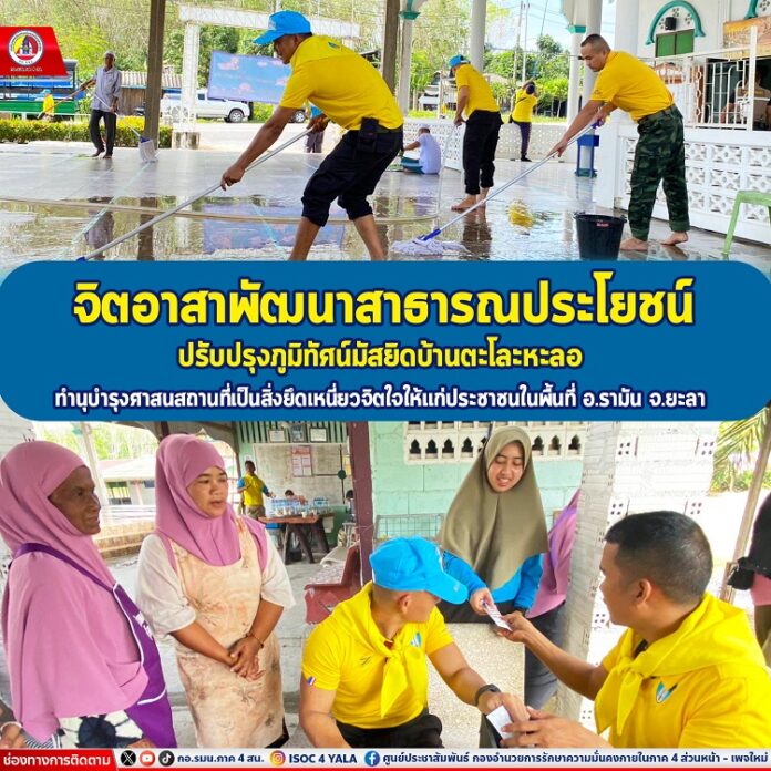 เมื่อวันที่ 16 กุมภาพันธ์ 2567 เวลา 09.00 น. หน่วยเฉพาะกิจกรมทหารพรานที่ 41 จัดกำลังพลจิตอาสากองร้อยทหารพรานที่ 4102 ร่วมกับหน่วยงานและประชาชนจิตอาสาในพื้นที่ตำบลตะโละหะลอ จัดกิจกรรมทำความสะอาด ปรับปรุงภูมิทัศน์บริเวณโดยรอบมัสยิดบ้านตะโละหะลอ หมู่ที่ 2 ตำบลตะโละหะลอ อำเภอรามัน จังหวัดยะลา เพื่อให้มัสยิดมีความสะอาด ร่มรื่น สวยงาม สะอาดตา ผู้ปฏิบัติศาสนกิจ ได้รับความสะดวก เจริญตา และเป็นการทำนุบำรุงศาสนสถาน เป็นสิ่งยึดเหนี่ยวจิตใจ อีกทั้งยังเป็นการปลูกจิตสำนึก สร้างจิตสาธารณะให้กับบุคคลในชุมชนที่เข้าร่วมกิจกรรม อีกทั้งยังเป็นการช่วยกันรักษาความสะอาด และช่วยกันรักษาสภาพแวดล้อมให้น่าอยู่ยิ่งขึ้นอีกด้วย