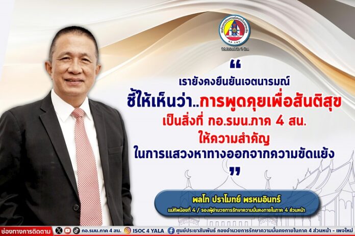 ประชาสัมพันธ์ข่าวประชาสัมพันธ์ “…เรายังคงยืนยันเจตนารมณ์ ชี้ให้เห็นว่า..การพูดคุยเพื่อสันติสุข เป็นสิ่งที่ กอ.รมน.ภาค 4 สน. ให้ความสำคัญในการแสวงหาทางออกจากความขัดแย้ง…” February 18, 2024 500 Share Facebook Twitter Google+ Telegram LINE พลโท ปราโมทย์ พรหมอินทร์ แม่ทัพน้อยที่ 4 / รองผู้อำนวยการรักษาความมั่นคงภายในภาค 4 ส่วนหน้า ศูนย์ประชาสัมพันธ์กองอำนวยการรักษาความมั่นคงภายในภาค4ส่วนหน้า