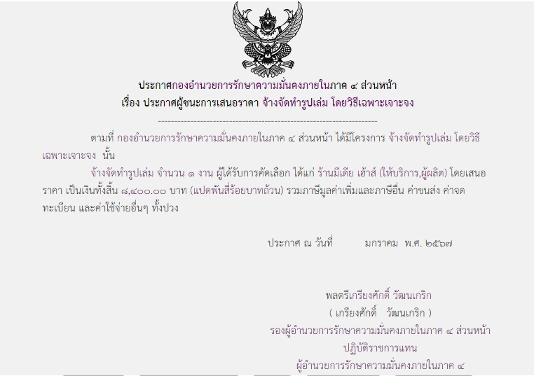 ประกาศผู้ชนะการเสนอราคา จ้างจัดทำรูปเล่ม โดยวิธีเฉพาะจง