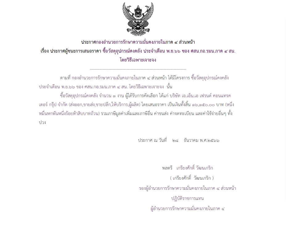 จัดซื้อ จัดจ้างประกาศผู้ชนะการเสนอราคา ประกาศผู้ชนะการเสนอราคา ซื้อวัสดุอุปกรณ์คงคลัง ประจำเดือน พ.ย.๖๖ ของ ศสน.กอ.รมน.ภาค ๔ สน. โดยวิธีเฉพาะเจาะจง February 19, 2024 357 Share Facebook Twitter Google+ Telegram LINE