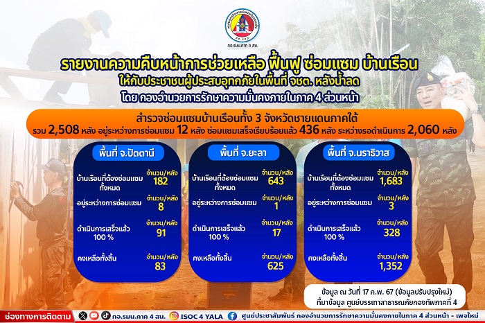จากสถานการณ์อุทกภัยในพื้นที่จังหวัดชายแดนภาคใต้ ทั้งจังหวัดปัตตานี ยะลา นราธิวาส และบางส่วนของจังหวัดสงขลา ที่เกิดขึ้นเมื่อวันที่ 22 – 26 ธันวาคม 2566 ที่ผ่านมา กองอำนวยการรักษาความมั่นคงภายในภาค 4 ส่วนหน้า โดย พลโท ศานติ ศกุนตนาค แม่ทัพภาคที่ 4 / ผู้อำนวยการรักษาความมั่นคงภายในภาค 4 ได้บูรณาการกับหน่วยงานในพื้นที่เข้าดำเนินการช่วยเหลือ ฟื้นฟู ซ่อมแซมบ้านเรือนให้แก่ประชาชนผู้ได้รับผลกระทบโดยทันที