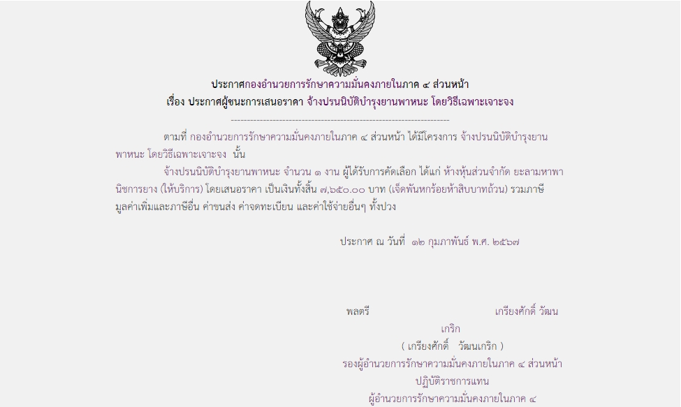 จัดซื้อ จัดจ้างประกาศผู้ชนะการเสนอราคา ประกาศผู้ชนะการเสนอราคา จ้างปรนนิบัติบำรุงยานพาหนะ โดยวิธีเฉพาะเจาะจง February 22, 2024 440 Share Facebook Twitter Google+ Telegram LINE