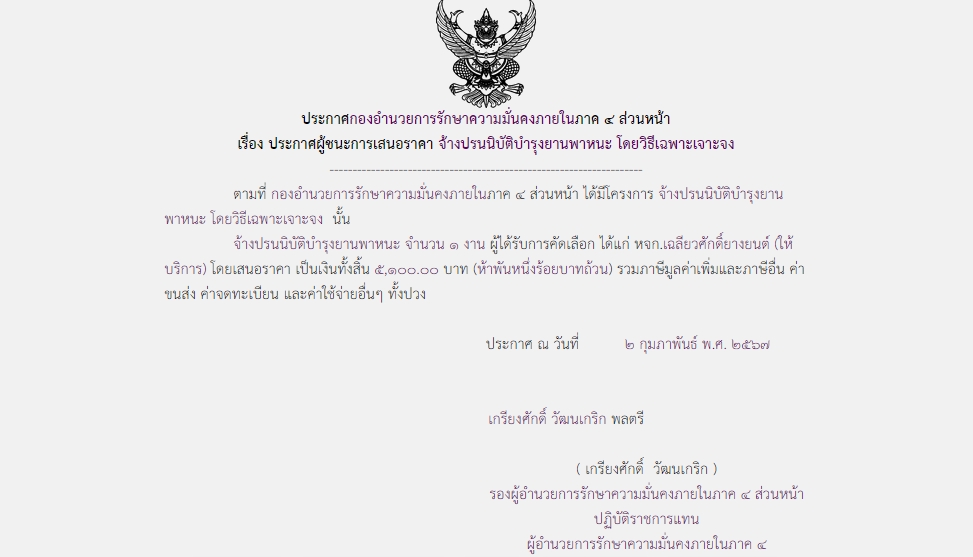 ประกาศผู้ชนะการเสนอราคา จ้างปรนนิบัติบำรุงยานพาหนะ โดยวิธีเฉพาะเจาะจง