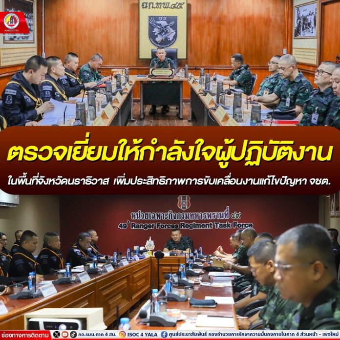 เมื่อวันนี้ (23 กุมภาพันธ์ 2567) เวลา 09.40 น. พลตรี เกรียงศักดิ์ วัฒนเกริก รองผู้อำนวยการรักษาความมั่นคงภายในภาค 4 ส่วนหน้า ลงพื้นที่ตรวจเยี่ยมให้กำลังใจกำลังพลผู้ปฏิบัติหน้าที่ในพื้นที่จังหวัดชายแดนภาคใต้ ประกอบด้วย หน่วยเฉพาะกิจกรมทหารพรานที่ 49 และหน่วยเฉพาะกิจกรมทหารพรานที่ 45 พร้อมรับฟังการบรรยายสรุป ตลอดจนปัญหาข้อขัดข้องในการปฏิบัติ เพื่อเพิ่มประสิทธิภาพในการขับเคลื่อนงานการแก้ไขปัญหาจังหวัดชายแดนภาคใต้ต่อไป