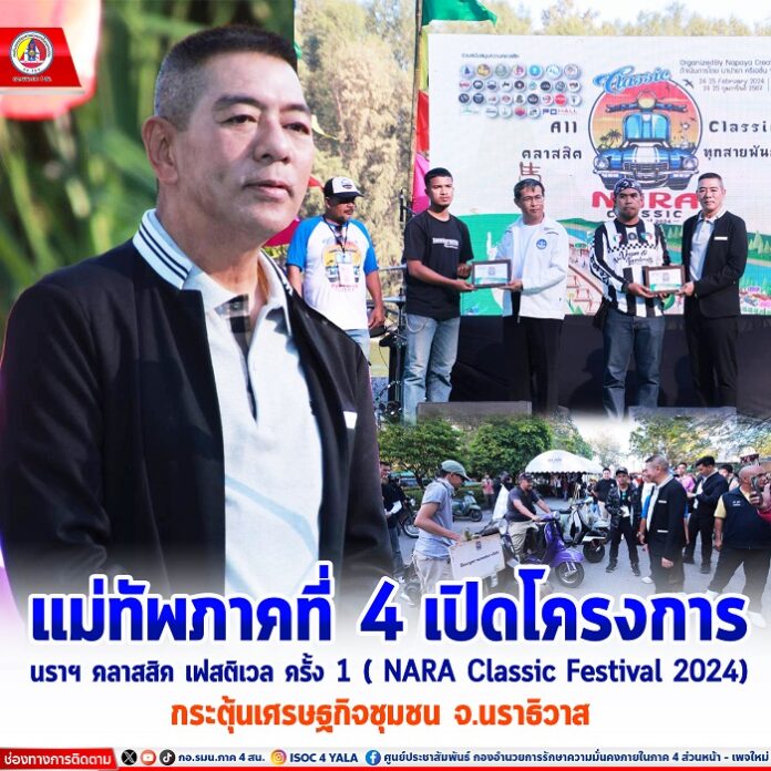 เมื่อวันที่ 24 กุมภาพันธ์ 2567 เวลา 16.00 น. ณ บริเวณหาดนราทัศน์ อำเภอเมือง จังหวัดนราธิวาส พลโท ศานติ ศกุนตนาค แม่ทัพภาคที่ 4/ ผู้อำนวยการรักษาความมั่นคงภายในภาค 4 เป็นประธานพิธีเปิดโครงการ นราฯที่วาด ตอนนราฯ คลาสสิค เฟสติเวล ครั้ง 1 ( NARA Classic Festival 2024) ซึ่งจังหวัดนราธิวาส โดยกลุ่มคนรักรถคลาสสิค นักสะสมผู้สนใจเรื่องรถคลาสสิค และ บริษัท นาปายาครีเอชั่น จำกัด ร่วมกันจัดขึ้น เพื่อส่งเสริมการท่องเที่ยว และกระตุ้นเศรษฐกิจชุมชนในพื้นที่จังหวัดนราธิวาส ตลอดจนสร้างภาพลักษณ์ และความสัมพันธ์อันดีระหว่าง นักท่องเที่ยวนอกพื้นที่ และประชากรในพื้นที่จังหวัดนราธิวาส โดยมี นายฉัตรชัย อุสาหะ รองผู้ว่าราชการจังหวัดนราธิวาส , พลตรี เฉลิมพร ขำเขียว ผู้บังคับหน่อยเฉพาะกิจนราธิวาส , นาวาเอกสันติ เกศศรีพงษ์ศา ผู้บังคับหน่วยเฉพาะกิจนาวิกโยธินกองทัพเรือ , ผู้อำนวยการการท่องเที่ยวแห่งประเทศไทย สำนักงานนราธิวาส, หัวหน้าส่วนราชการ ,สมาชิกกลุ่มสะสมรถคลาสสิค ในพื้นที่จังหวัดนราธิวาส ยะลา ปัตตานี และกลุ่มนักสะสมรถคลาสสิคประเทศมาเลเซีย ให้การต้อนรับ และเข้าร่วมกิจกรรม