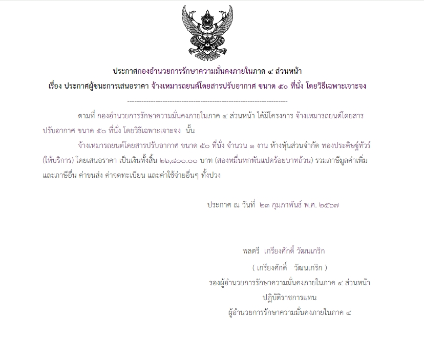 จัดซื้อ จัดจ้างประกาศผู้ชนะการเสนอราคา ประกาศผู้ชนะการเสนอราคา จ้างเหมารถยนต์โดยสารปรับอากาศ ขนาด ๕๐ ที่นั่ง โดยวิธีเฉพาะเจาะจง February 26, 2024 482 Share Facebook Twitter Google+ Telegram LINE