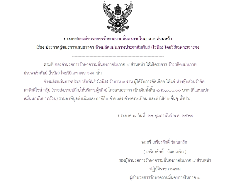 จัดซื้อ จัดจ้างประกาศผู้ชนะการเสนอราคา ประกาศผู้ชนะการเสนอราคา จ้างผลิตแผ่นภาพประชาสัมพันธ์ (ไวนิล) โดยวิธีเฉพาะเจาะจง February 26, 2024 447 Share Facebook Twitter Google+ Telegram LINE