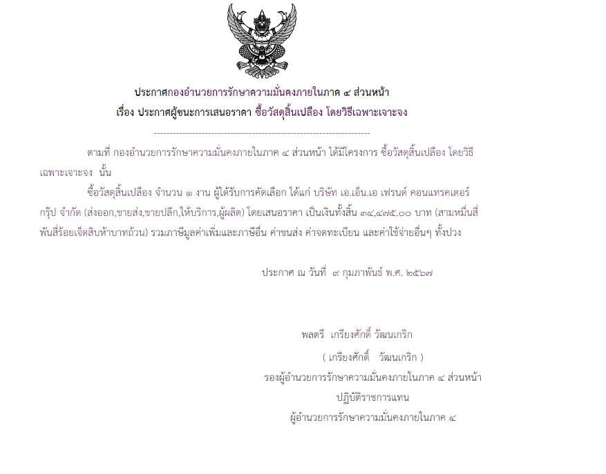 ประกาศผู้ชนะการเสนอราคา ซื้อวัสดุสิ้นเปลือง โดยวิรีเฉพาะเจาะจง