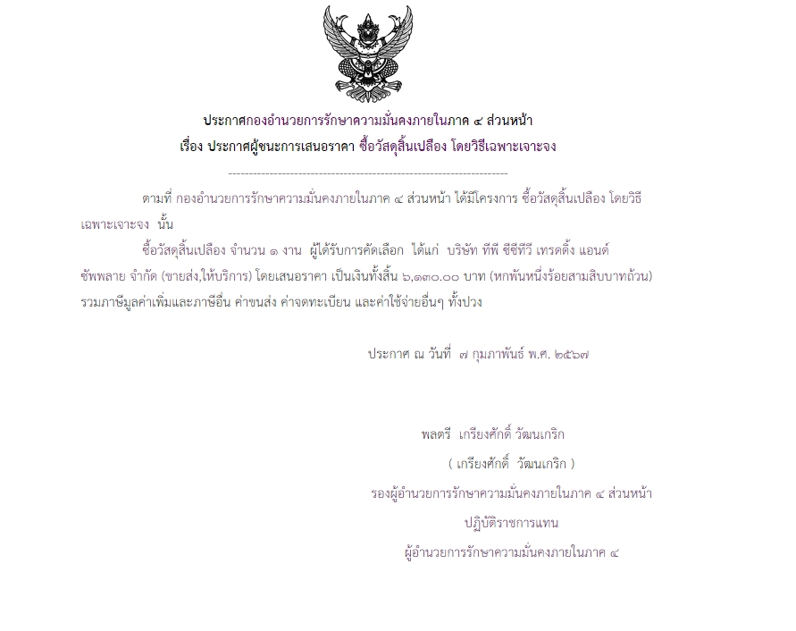 ประกาศผู้ชนะการเสนอราคา ซื้อวัสดุสิ้นเปลือง โดยวิรีเฉพาะเจาะจง