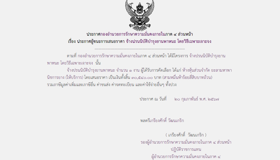 ประกาศผู้ชนะการเสนอราคา จ้างปรนนิบัติบำรุงยานพาหนะ โดยวิธีเฉพาะเจาะจง