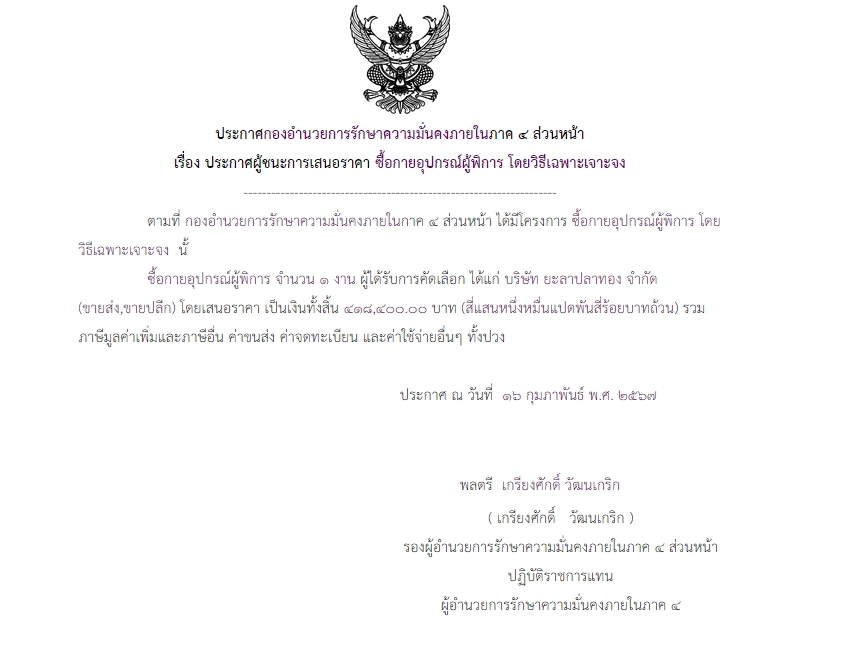 ประกาศผู้ชนะการเสนอราคา ซื้อกายอุปกรณ์ผู้พิการ โดยวิธีเฉพาะเจาะจง