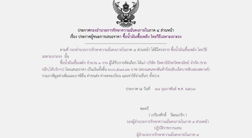 ประกาศผู้ชนะการเสนอราคา ซื้อน้ำมันเชื้อเพลิง โดยวิธีเฉพาะเจาะจง