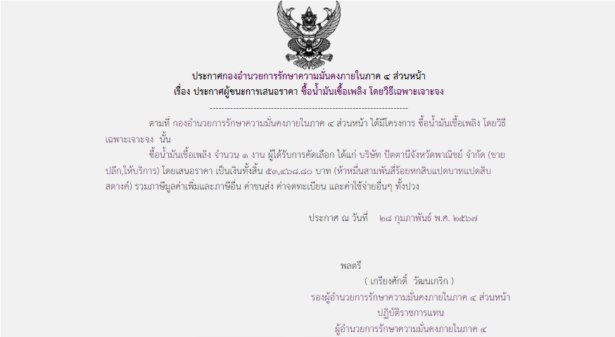 ประกาศผู้ชนะการเสนอราคา ซื้อน้ำมันเชื้อเพลิง โดยวิธีเฉพาะเจาะจง