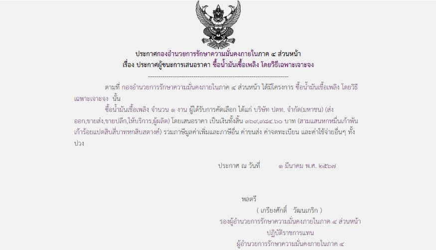 ประกาศผู้ชนะการเสนอราคา ซื้อน้ำมันเชื้อเพลิง โดยวิธีเฉพาะเจาะจง