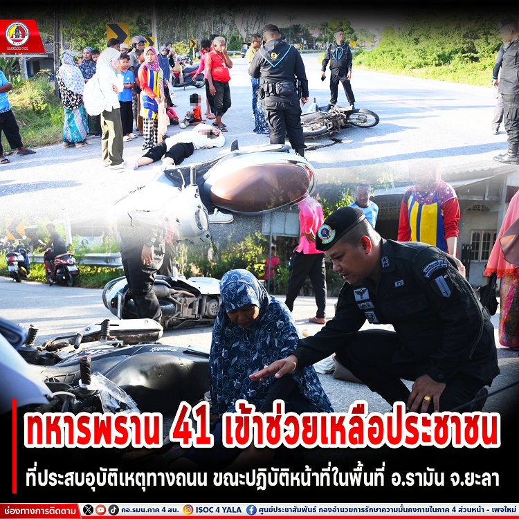 เมื่อวันที่ 5 มีนาคม 2567 เวลา 16.45 น. พันตรี ชิงชัย ชินณวงษ์ เสนาธิการหน่วยเฉพาะกิจกรมทหารพรานที่ 41 พร้อมคณะ เร่งเข้าให้การช่วยเหลือประชาชนที่ประสบอุบัติเหตุบนท้องถนนบริเวณถนนเส้นวงเวียนตะโละหะลออย่างเร่งด่วน ในขณะที่กำลังเดินทางลงพื้นที่ตรวจเยี่ยมหน่วยขึ้นตรงในพื้นที่ตำบลตะโล๊ะหะลอ อำเภอรามัน จังหวัดยะลานั้น ก็มีชาวบ้านในพื้นที่ขับรถพร้อมชะลอความเร็ว และตะโกนขอความช่วยเหลือว่า “#ข้างหน้ามีเหตุรถชนกันขอให้ทหารไปช่วยดูหน่อยครับ” สิ้นสุดคำพูดของชาวบ้าน เสนาธิการหน่วยเฉพาะกิจกรมทหารพรานที่ 41 นำทีมลงพื้นที่ไปที่เกิดเหตุทันที
