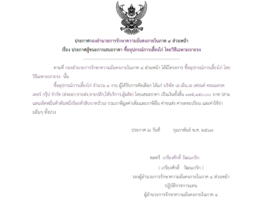 ประกาศผู้ชนะการเสนอราคา ซื้ออุปกรณ์การเลี้ยงไก่ โดยวิธีเฉพาะเจาะจง