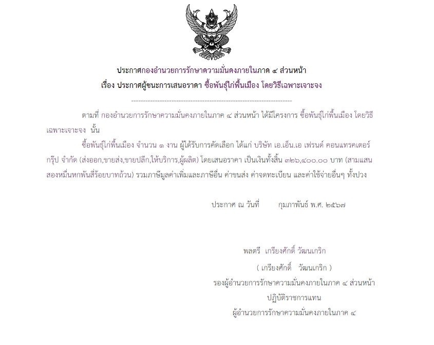 ประกาศผู้ชนะการเสนอราคา ซื้อพันธุ์ไก่พื้นเมือง โดยวิธีเฉพาะเจาะจง