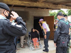 พันเอกนายแพทย์ โชคชัย ขวัญพิชิต รองผู้อำนวยการศูนย์อำนวยการแพทย์จังหวัดชายแดนภาคใต้ (ศอชต.) พร้อมคณะ ลงพื้นที่บริเวณ บ้านเลขที่ 563 บ้านตะบิงติงงี หมู่ที่ 1 ตำบลตลิ่งชัน อำเภอบันนังสตา จังหวัดยะลา เพื่อมอบรถวีลแชร์ให้กับ นางหะยีแอเสาะ เจะโด ซึ่งเป็นผู้ป่วยติดเตียง เพื่อให้การช่วยเหลือประชาชนที่มีความยากลำบากในการใช้ชีวิตเป็นผู้ป่วยผู้พิการที่ต้องการกายอุปกรณ์เพื่อให้การดำเนินชีวิตมีคุณภาพที่ดีมากยิ่งขึ้น โดยมี พันเอก ชาตินักรบ พรศิริรัตน์ ผู้บังคับหน่วยเฉพาะกิจกรมทหารพรานที่ 30 พัฒนาการอำเภอบันนังสตา, ผู้ใหญ่บ้าน, ผู้นำหมู่บ้าน, อาสาสมัครสาธารณสุขประจำหมู่บ้าน และประชาชนในพื้นที่ร่วมกิจกรรมดังกล่าว