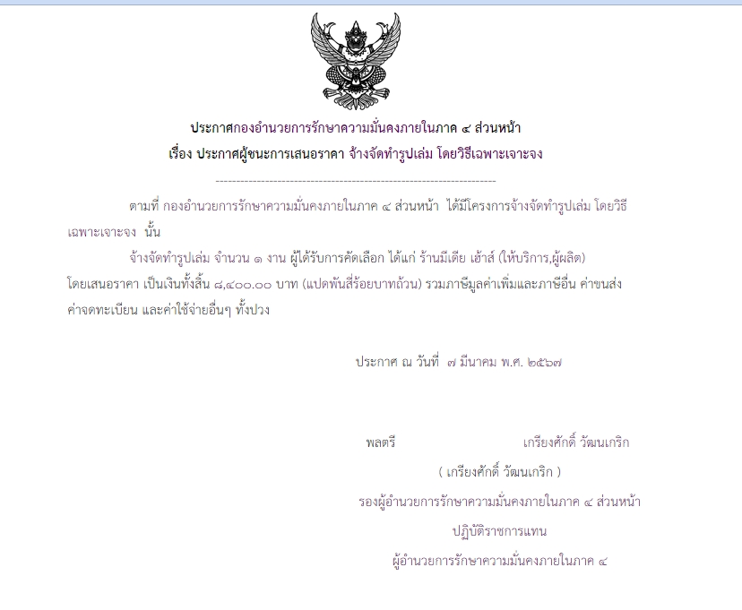 ประกาศผู้ชนะการเสนอราคา จ้างจัดทำรูปเล่ม โดยวิธีเฉพาะเจาะจง