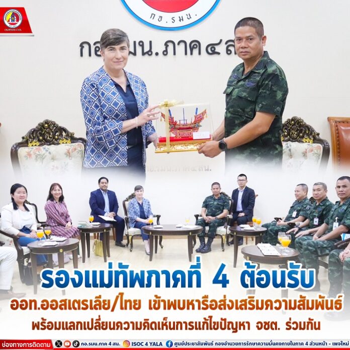 วันนี้ (20 มีนาคม 2567) เวลา 10.00 น. ที่ห้องรับรอง กองอำนวยการรักษาความมั่นคงภายในภาค 4 ส่วนหน้า ตำบลเขาตูม อำเภอยะรัง จังหวัดปัตตานี พลตรี ไพศาล หนูสังข์ รองแม่ทัพภาคที่ 4/ รองผู้อำนวยการรักษาความมั่นคงภายในภาค 4 ส่วนหน้า และคณะฯ ให้การต้อนรับ ดร.แองเจลา แมคโดนัลด์ (Dr. Angela Macdonald) เอกอัครราชทูตออสเตรเลียประจำประเทศไทย และคณะฯ เข้าพบเพื่อหารือและรับทราบสถานการณ์ในพื้นที่จังหวัดชายแดนภาคใต้ รวมทั้งแลกเปลี่ยนข้อคิดเห็นเกี่ยวกับการแก้ไขปัญหาในพื้นที่จังหวัดชายแดนภาคใต้ เพื่อแสวงหาความร่วมมือระหว่างกัน โดยมี ผู้บังคับบัญชาของกองอำนวยการรักษาความมั่นคงภายในภาค 4 ส่วนหน้า และเจ้าหน้าที่ที่เกี่ยวข้องร่วมให้การต้อนรับ