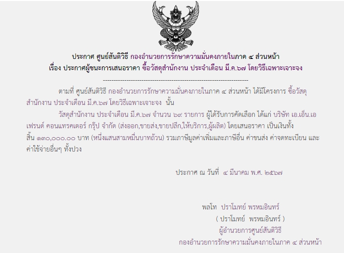 ประกาศผู้ชนะการเสนอราคา ซื้อวัสดุสำนักงาน ประจำเดือน มี.ค.๖๗ โดยวิธีเฉพาะเจาะจง