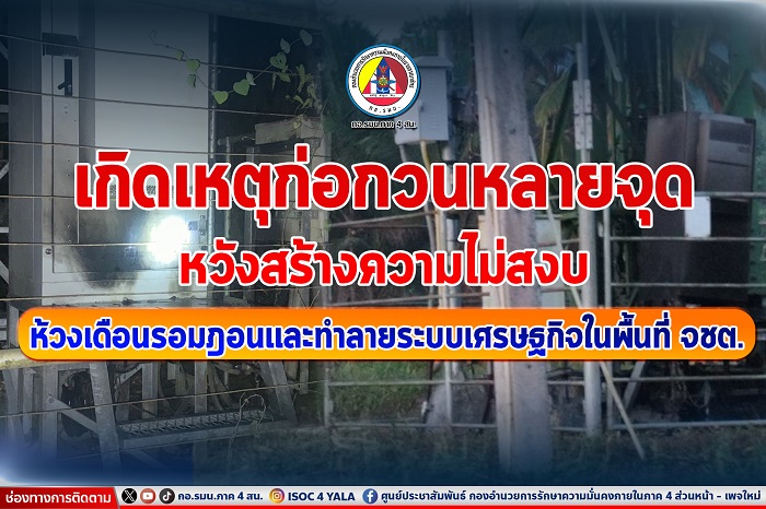 เมื่อวันที่ 22 มีนาคม 2567 เมื่อเวลาประมาณ 01.00 น. เป็นต้นไป ได้เกิดเหตุก่อกวนหลายจุด ในเขตจังหวัดปัตตานี, จังหวัดยะลา และจังหวัดนราธิวาส หวังทำลายระบบเศรษฐกิจ สาธารณูปโภค ลดความเชื่อมั่นของเจ้าหน้าที่ความมั่นคง และพยายามสร้างสถานการณ์ทำลายบรรยากาศเดือนรอมฎอนสันติสุข ล่าสุด เจ้าหน้าที่เข้าตรวจสอบพื้นที่ อยู่ระหว่างรวบรวมวัตถุพยาน และเก็บพยานหลักฐานเพื่อดำเนินการในส่วนที่เกี่ยวข้อง ความคืบหน้าจะรายงานให้ทราบต่อไป