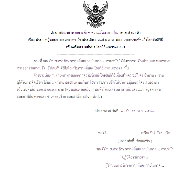 จัดซื้อ จัดจ้างประกาศผู้ชนะการเสนอราคา ประกาศผู้ชนะการเสนอราคา จ้างประเมินงานแสวงหาทางออกจากความขัดแย้งโดยสันติวิธี เพื่อเสริมความมั่นคง โดยวิธีเฉพาะเจาะจง March 23, 2024 280 Share Facebook Twitter Google+ Telegram LINE