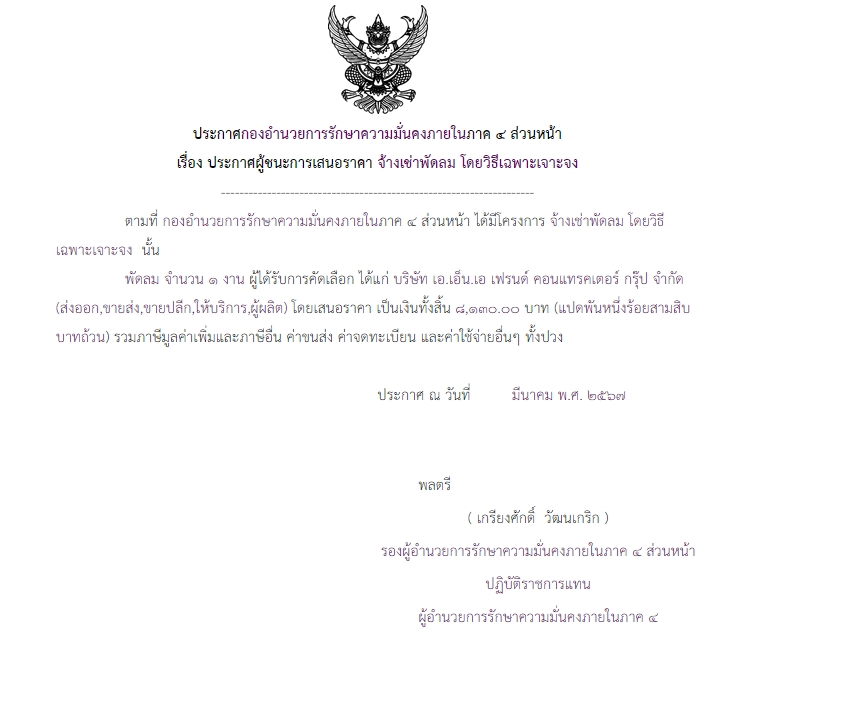 ประกาศผู้ชนะการเสนอราคา จ้างเช่าพัดลม โดยวิรีเฉพาะเจาะจง