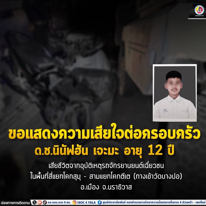 กอ.รมน.ภาค 4 สน. ขอแสดงความเสียใจต่อครอบครัว เด็กชายนินัฟฮัน เจะมะ อายุ 12 ปี ซึ่งเสียชีวิตจากอุบัติเหตุ ในการขับขี่รถจักรยานยนต์ ยี่ห้อฮอนด้า รุ่นเวฟไอ สีดำ หมายเลขทะเบียน 1 กต 5169 นราธิวาส ข้ามเส้นแบ่งช่องทางจราจร ทำให้รถจักรยานยนต์เกิดการเฉี่ยวชนกับรถยนต์หุ้มเกราะล้อยาง Reva III S ของหน่วยเฉพาะกิจตำรวจตระเวนชายแดนที่ 9321 ขณะเจ้าหน้าที่ออกปฏิบัติภารกิจรักษาความปลอดภัยเส้นทาง การจัดงานฉลองศาลาการเปรียญวัดบางปอ ประจำปี 2567 ในระหว่างวันที่ 22 – 25 มีนาคม 2567 ในพื้นที่สี่แยกโคกสุมุ – สามแยกโคกตีเต (ทางเข้าวัดบางปอ) อำเภอเมือง จังหวัดนราธิวาส ซึ่งเจ้าหน้าที่ได้นำ เด็กชายนินัฟฮัน เจะมะ ส่งโรงพยาบาลนราธิวาสราชนครินทร์ และเสียชีวิตในเวลาต่อมา เหตุเกิดเมื่อวันที่ 22 มีนาคม 2567 เวลา 20.20 น. ที่ผ่านมา