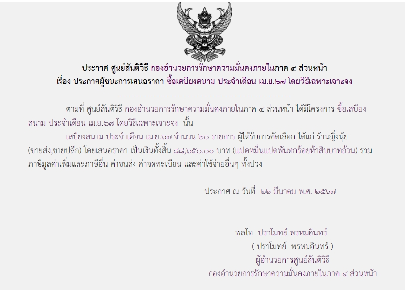 ประกาศผู้ชนะการเสนอราคา ซื้อเสบียงสนาม ประจำเดือน เม.ย.๖๗ โดยวิธีเฉพาะเจาะจง