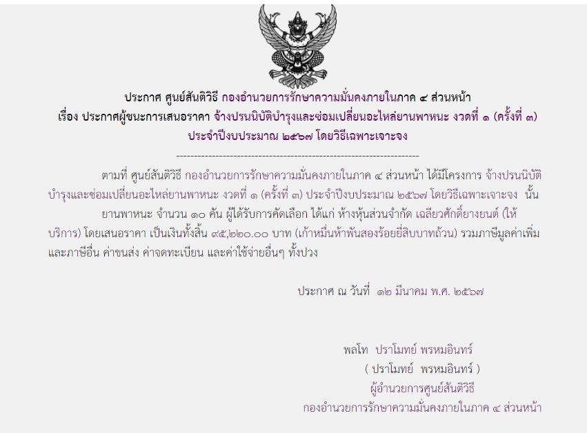 จัดซื้อ จัดจ้างประกาศผู้ชนะการเสนอราคา ประกาศผู้ชนะการเสนอราคา จ้างปรนนิบัติบำรุงและซ่อมเปลี่ยนอะไหล่ยานพาหนะ งวดที่ ๑ (ครั้งที่ ๓) ประจำปีงบประมาณ ๒๕๖๗ โดยวิธีเฉพาะเจาะจง March 27, 2024 312 Share Facebook Twitter Google+ Telegram LINE