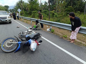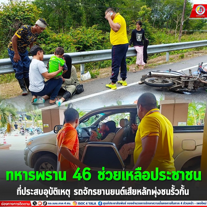 วันที่ 27 มีนาคม 2567 เวลา 11.00 น. หน่วยเฉพาะกิจกรมทหารพรานที่ 46 โดยกองร้อยทหารพรานที่ 4606 พร้อมด้วยกำลังพลได้เข้าให้การช่วยเหลือประชาชนที่ประสบอุบัติเหตุรถจักรยานยนต์ วูบหลับใน เสียหลักพุ่งชนรั้วกั้น บนเส้นทาง 4107 พื้นที่ หมู่ที่ 1 บ้านบือแรง ตำบลลาโละ อำเภอรือเสาะ จังหวัดนราธิวาส พร้อมทั้งใช้ยานพาหนะของหน่วยในการนำส่งผู้ได้รับบาดเจ็บจำนวน 3 ราย เพื่อเข้ารับการรักษาไปยังโรงพยาบาลรือเสาะ จังหวัดนราธิวาส ต่อไป