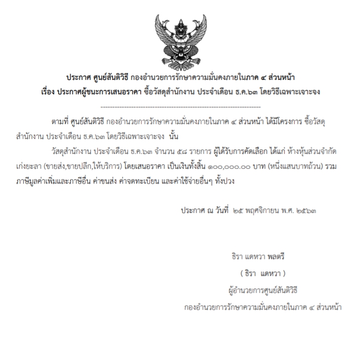 ประกาศผู้ชนะการเสนอราคา ซื้อวัสดุสำนักงาน ประจำเดือน ธ.ค.๖๓ โดยวิธีเฉพาะเจาะจง