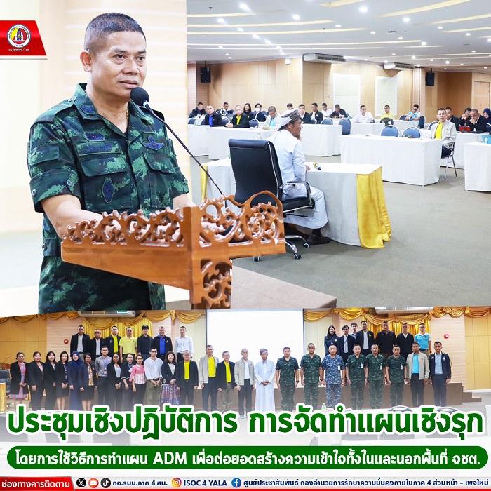 วันนี้ (28 มีนาคม 2567) เวลา 10.00 น. ที่สำนักงานศูนย์อำนวยการบริหารจังหวัดชายแดนภาคใต้ (ศูนย์ราชการจังหวัดชายแดนภาคใต้ตอนล่าง) ตำบลสะเตง อำเภอเมือง จังหวัดยะลา พลตรี ไพศาล หนูสังข์ รองแม่ทัพภาคที่ 4/รองผู้อำนวยการรักษาความมั่นคงภายในภาค 4 ส่วนหน้า ตรวจเยี่ยมการประชุมเชิงปฏิบัติการ การจัดทำแผนเชิงรุก โดยการใช้วิธีการจัดทำแผน ADM ภายใต้โครงการสร้างความเข้าใจประชาชนทั้งในและนอกพื้นที่จังหวัดชายแดนภาคใต้ ประจำปีงบประมาณ พ.ศ. 2567 โดยมี ผู้แทนจากกองอำนวยการรักษาความมั่นคงภายในภาค 4 ส่วนหน้า, กรมประชาสัมพันธ์, ศูนย์อำนวยการบริหารจังหวัดชายแดนภาคใต้ , สำนักงานจังหวัด ตลอดจนเจ้าหน้าที่ที่เกี่ยวข้องเข้าร่วม