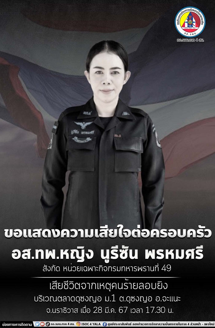 เมื่อวันที่ 28 มีนาคม 2567 เวลา 17.30 น. เกิดเหตุคนร้ายใช้อาวุธปืนลอบยิง อาสาสมัคร ทหารพรานหญิง นูรีซัน พรหมศรี สังกัดหน่วยเฉพาะกิจกรมทหารพรานที่ 49 ช่วยราชการกองอำนวยการรักษาความมั่นคงภายในภาค 4 ส่วนหน้า เหตุเกิดบริเวณพื้นที่ ตลาดดุซงญอ หมู่ที่ 1 ตำบลดุซงญอ อำเภอจะแนะ จังหวัดนราธิวาส ทั้งนี้ผู้เสียชีวิตอยู่ในระหว่างลาพัก และได้ไปช่วยญาติขายอาหารอยู่ในตลาด ซึ่งเป็นห้วงเวลาที่มีประชาชน มาจับจ่ายซื้อสินค้าอุปโภค-บริโภค เป็นจำนวนมาก จนกระทั่งถูกคนร้ายลอบยิงเสียชีวิตในที่เกิดเหตุ