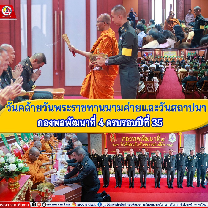 เมื่อวันที่ 28 มีนาคม 2567 เวลา 10.00 น. ที่กองพลพัฒนาที่ 4 อำเภอคลองหอยโข่ง จังหวัดสงขลา พลโท ศานติ ศกุนตนาค แม่ทัพภาคที่ 4/ผู้อำนวยการรักษาความมั่นคงภายในภาค 4 เป็นประธานในพิธีวันคล้ายวันพระราชทานนามค่าย และวันสถาปนากองพลพัฒนาที่ 4 ครบรอบปีที่ 35 โดยมี พลตรี กรกฎ ภู่โชติ ผู้บัญชาการกองพลพัฒนาที่ 4 ,พลตรี เฉลิมพร ขำเขียว ผู้บัญชาการกองพลทหารราบที่ 15 , พลตรี คมกฤช รัตนฉายา รองแม่ทัพน้อยที่ 4 , พลตรี ปกรณ์ จันทรโชตะ ผู้บัญชาการมณฑลทหารบกที่ 42 ,พลตรี อภินันท์ แจ่มแจ้ง ผู้บัญชาการกองพลทหารราบที่ 5 ตลอดจนคณะผู้บังคับบัญชา และกำลังพลกองพลพัฒนาที่ 4 ร่วมในพิธี