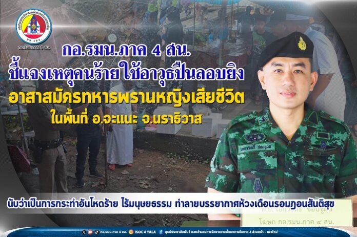 จากกรณีเหตุการณ์คนร้ายใช้อาวุธปืนลอบยิง อาสาสมัครทหารพรานหญิง นูรีซัน พรหมศรี สังกัดหน่วยเฉพาะกิจกรมทหารพรานที่ 49 ช่วยราชการกองอำนวยการรักษาความมั่นคงภายในภาค 4 ส่วนหน้า เสียชีวิตในที่เกิดเหตุ บริเวณตลาดดุซงญอ ตำบลดุซงญอ อำเภอจะแนะ จังหวัดนราธิวาส เมื่อวันที่ 28 มีนาคม 2567 ที่ผ่านมา