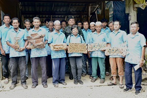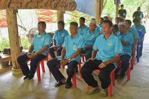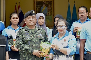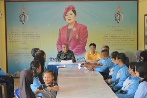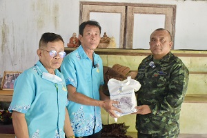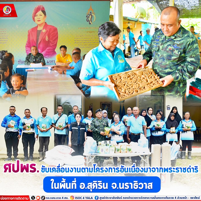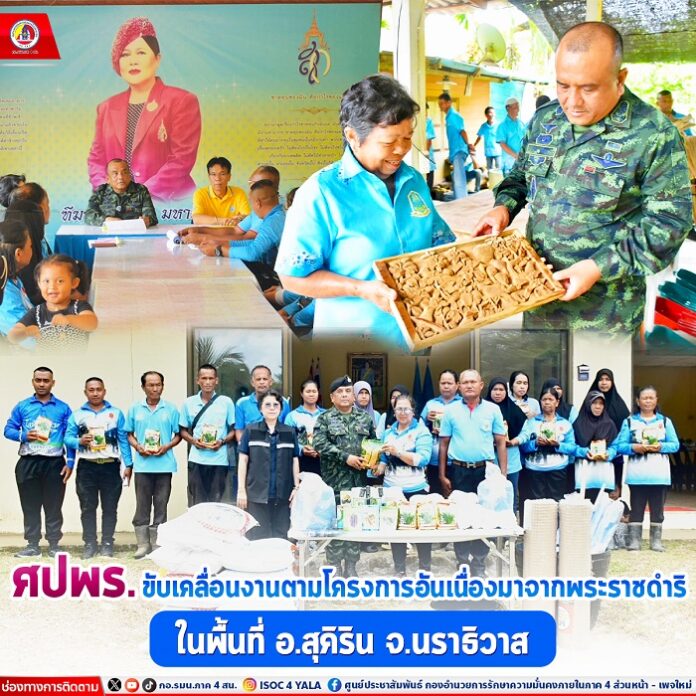 จากนั้นพันเอก กําธร ศรีเกตุ หัวหน้าคณะทำงานฯ ที่ 3 พร้อมคณะ เดินทางต่อไปยัง กลุ่มศิลปาชีพแกะสลักไม้บ้านเล็กในป่าใหญ่ ตรวจเยี่ยม พบปะ สานสัมพันธ์สมาชิกศิลปาชีพ รวมทั้งได้สอบถามความเป็นอยู่ ปัญหาข้อขัดข้องในการดำเนินงาน ตลอดจนได้มอบวัสดุอุปกรณ์ในกิจกรรมสนับสนุนวัสดุโครงการศิลปาชีพ และถุงผ้าในกิจกรรมสานสัมพันธ์ศิลปาชีพ ให้กับสมาชิก เพื่อเป็นขวัญและกำลังใจในการปฎิบัติหน้าที่ต่อไป ซึ่งกลุ่มศิลปาชีพแกะสลักไม้บ้านเล็กในป่าใหญ่ จัดตั้งขึ้น เมื่อวันที่ 2 กันยายน 2530 สมเด็จพระนางเจ้าสิริกิติ์ พระบรมราชินีนาถ พระบรมราชชนนีพันปีหลวง ปฎิบัติพระราชกรณียกิจในพื้นที่ จังหวัดนราธิวาส เสด็จพระราชดำเนินไปทรงเยี่ยมพสกนิกร และสมาชิกนิคมสร้างตนเองสุคิริน ณ วัดโต๊ะโม๊ะ ตำบลภูเขาทอง อำเภอสุคิริน จังหวัดนราธิวาส พระองค์ทรงเห็นว่าในพื้นที่ ตำบลภูเขาทองมีฝนตกชุก ไม่สามารถประกอบอาชีพได้ทุกวัน และราษฎรในพื้นที่ตำบลภูเขาทอง เป็นผู้อพยพมาจากภาคอีสาน ซึ่งมีความรู้ ความชำนาญในด้านงานฝีมือ เป็นอย่างดี ซึ่งได้แก่ การทอผ้า การปักผ้า และ การแกะสลักไม้ จึงทรงรับให้เป็นสมาชิกโครงการศิลปาชีพ เพื่อเป็นอาชีพเสริม จะได้มีรายได้เลี้ยงดูตนเอง และครอบครัว โดยกลุ่มศิลปาชีพแกะสลักไม้ บ้านเล็กในป่าใหญ่ได้ดำเนินงานจัดทำชิ้นงานตามรายการสินค้า จากกองงานศิลปาชีพ สำนักพระราชวัง โดยศูนย์ประสานงานโครงการอันเนื่องมาจากพระราชดำริ ประสานงานร่วมกับ กรมทหารราบที่ 3 กองพลนาวิกโยธิน ค่ายจุฬาภรณ์ ดำเนินการเป็นผู้รวบรวมนำส่งไปยัง สำนักพระราชวัง สวนจิตรลดา