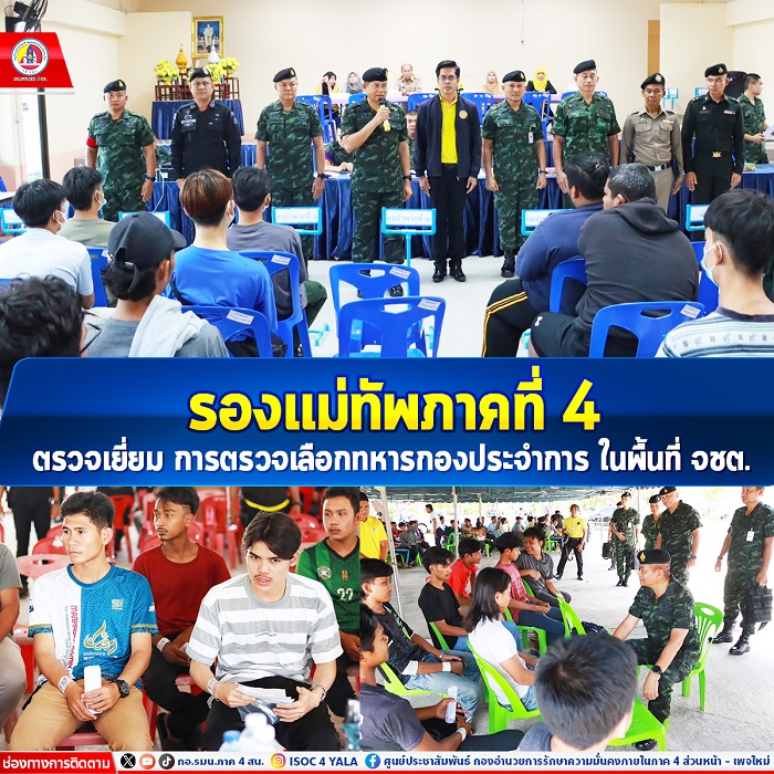 วันนี้ (1 เมษายน 2567) เวลา 10.00 น. พลตรี ไพศาล หนูสังข์ รองแม่ทัพภาคที่ 4/รองผู้อำนวยการรักษาความมั่นคงภายในภาค 4 ส่วนหน้า ลงพื้นที่ตรวจเยี่ยมหน่วยคัดเลือกทหารกองเกินเข้ากองประจำการ ประจำปี 2567 ในพื้นที่จังหวัดชายแดนภาคใต้ ประกอบด้วย หอประชุมอำเภอกาบัง จังหวัดยะลา , หอประชุมอำเภอสุคิริน จังหวัดนราธิวาส และที่ว่าการอำเภอแม่ลาน จังหวัดปัตตานี โดยได้เน้นย้ำต่อคณะกรรมการตรวจเลือกทหารฯ ให้ปฏิบัติงานทุกขั้นตอนด้วยความโปร่งใส บริสุทธิ์ และยุติธรรม พร้อมเชิญชวนผู้เข้ารับการตรวจเลือกหทารฯ เข้ามาเป็นครอบครัวเดียวกัน เข้ามาฝึกระเบียบวินัย ความเป็นผู้นำ มีงาน มีรายได้ ต่อยอดโอกาสในการเข้ารับราชการทหารในอนาคต
