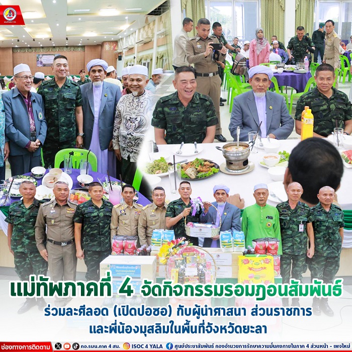 และโอกาสนี้แม่ทัพภาคที่ 4/ ผู้อำนวยการรักษาความมั่นคงภายในภาค 4 ได้มอบสิ่งของอุปโภคบริโภค และสนับสนุนงบประมาณในการละศีลอดให้แก่ผู้นำศาสนา เพื่อนำไปแจกจ่ายให้พี่น้องประชาชนได้นำประกอบการเปิดปอซออีกด้วย
