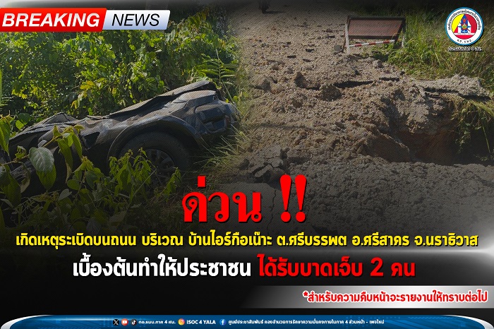 เมื่อวันนี้ (วันที่ 2 เมษายน 2567) เวลาประมาณ 14.55 น. เกิดเหตุคนร้ายลอบวางระเบิดแสวงเครื่องถนนหมายเลข 4013 ในพื้นที่ บ้านไอร์กือเน๊าะ หมู่ที่ 5 ตำบลศรีบรรพต อำเภอศรีสาคร จังหวัดนราธิวาส เป็นเหตุให้ประชาชนได้รับบาดเจ็บ จำนวน 2 คน รายละเอียดดังนี้