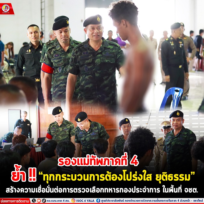 วันนี้ 2 เมษายน 2567 เวลา 08.00 น. พลตรี ไพศาล หนูสังข์ รองแม่ทัพภาคที่ 4/รองผู้อำนวยการรักษาความมั่นคงภายในภาค 4 ส่วนหน้า ลงพื้นที่ตรวจเยี่ยมหน่วยคัดเลือกทหารกองเกินเข้ากองประจำการ ประจำปี 2567 ในพื้นที่จังหวัดชายแดนภาคใต้ ประกอบด้วย หอประชุมอำเภอโคกโพธิ์ จังหวัดปัตตานี, ศาลาประชาคม อำเภอยะหา จังหวัดยะลา และหอประชุมอำเภอแว้ง จังหวัดนราธิวาส โดยมีผู้บังคับหน่วยเฉพาะกิจปัตตานี และผู้บังคับบัญชาในพื้นที่ร่วมให้การต้อนรับ พร้อมติดตามการปฏิบัติงานของคณะกรรมการตรวจเลือกทุกขั้นตอน ให้เป็นไปตามนโยบายของกองทัพบก โดยการตรวจเลือกต้องเป็นไปด้วยความโปร่งใส ยุติธรรม รวดเร็ว และตรวจสอบได้ ตลอดจนได้พบปะให้กำลังใจชายไทย ที่เข้ารับการตรวจเลือกทหาร รวมทั้งผู้ปกครอง และญาติที่มาให้กำลังใจบุตรหลาน
