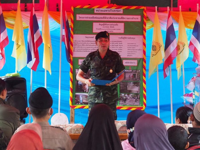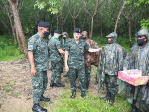 วันที่ 27 พฤศจิกายน 2563 เวลา 10.00 น. พลตรี ศานติ ศกุนตนาค ผู้บังคับหน่วยเฉพาะกิจสงขลา พร้อมคณะ ลงพื้นที่ตรวจเยี่ยมการปฏิบัติตามแผนเชิงรุก ในส่วนของ ชป.จรยุทธ์ ร้อย.ร.2534 บ้านคลองขุด หมู่ 6 ตำบลปากบาง อำเภอ เทพา และ พบปะให้โอวาทกำลังพล ณ ฐานปฏิบัติการ ร้อย.ร. 2534 หน่วยเฉพาะกิจสงขลา 40 หมู่ 7 บ้านควนติหนุน ตำบลปากบาง อำเภอเทพา จังหวัดสงขลา โดยพบปะเยี่ยมให้กำลังใจ เจ้าหน้าที่ พร้อมมอบหมายแนวทางการปฏิบัติงาน เน้นย้ำให้กำลังพลปฏิบัติหน้าที่ด้วยความไม่ประมาท และมีความพร้อมทุกสถานการณ์ พร้อมกันนี้ยังได้เน้นย้ำให้กำลังพลดูแลสุขภาพให้แข็งแรง ถึงแม้สภาพอากาศไม่อำนวย และอยู่ในช่วงฤดูฝน แต่การปฏิบัติหน้าที่ดูแลความปลอดภัยให้ประชาชนยังคง ต้องปฏิบัติเช่นเดิม ก่อนจะเดินทางต่อไปเป็นประธานพิธีมอบบ้านให้กับ นายเจ๊ะหยอ เตี๊ยนหิ้น ตามโครงการ “หน่วยเฉพาะกิจสงขลา ช่วยเหลือประชาชน” ด้วยการซ่อมแซมที่พักอาศัยให้กับประชาชนที่มีความยากลำบาก พร้อมมอบสิ่งของอุปโภคบริโภค เพื่อให้ประชาชนมีคุณภาพชีวิตที่ดีขึ้น ณ บ้านเลขที่ 101 หมู่ 1 บ้านบ่อเตย ตำบลปากบาง อำเภอเทพา จังหวัดสงขลา สร้างความดีใจและมีความปลาบปลื้มใจให้กับนายเจ๊ะหยอ และครอบครัวเป็นอย่างมาก