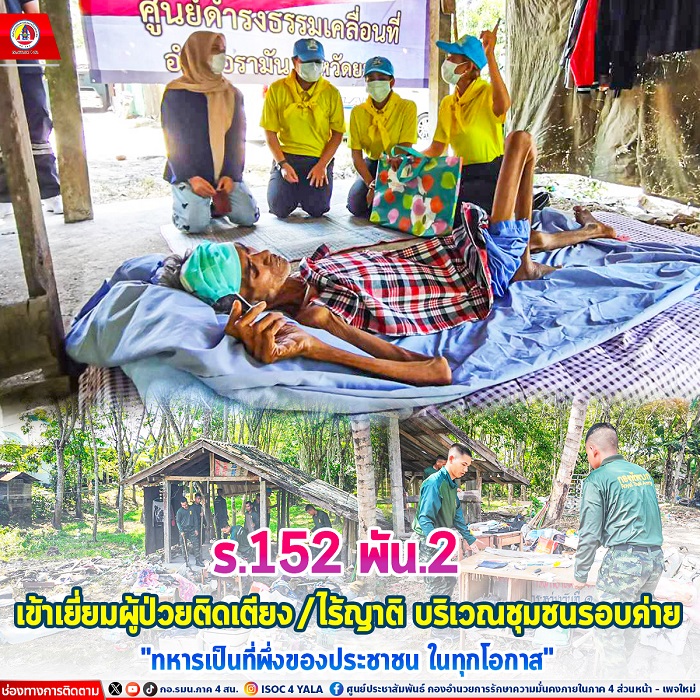 เมื่อวันที่ 4 เมษายน 2567 เวลา 09.00 น. พันโท สว่างพงษ์ อบแพทย์ กองพันทหารราบที่ 2 กรมทหารราบที่ 152 มอบหมายให้ ฝ่ายกิจการ กองพันทหารราบที่ 2 กรมทหารราบที่ 152 นำกำลังพลจิตอาสา ร่วมกับ เจ้าหน้าที่อาสาสมัครสาธารณสุขประจำหมู่บ้าน/บัณฑิตอาสา เข้าช่วยเหลือปรับปรุง จัดระเบียบที่พักอาศัยของ นายอิฮ์กอมัด หวังพิทักษ์ บ้านเลขที่ 22 หมู่ที่ 6 ตำบลวังพญา อำเภอรามัน จังหวัดยะลา ผู้ป่วยติดเตียง/ไร้ญาติ ที่อาศัยพักในขนำสวนยางของเพื่อนบ้าน ที่จะกลับพักฟื้น หลังจากออกโรงพยาบาลรามัน พร้อมกันนี้ ได้นำสมาชิกแม่บ้านจิตอาสาของหน่วย เข้าพบปะเยี่ยมผู้ป่วยและมอบสิ่งของอุปโภคบริโภค/ยาสามัญประจำบ้าน ให้การช่วยเหลือเบื้องต้น หลังผู้ป่วยติดเตียงกลับจากโรงพยาบาล ณ ชุมชนรอบค่าย บ้านหัวควน หมู่ที่ 6 (ฝั่งปรามะ) ตำบลวังพญา อำเภอรามัน จังหวัดยะลา