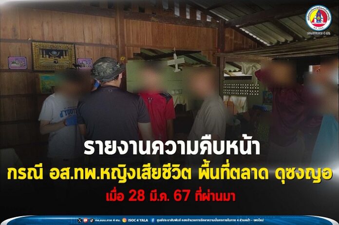 เมื่อวันที่ 5 เมษายน 2567 เวลา 10.00 น. หน่วยปฏิบัติการพิเศษร่วมประจำจังหวัดนราธิวาส ร่วมกับ สถานีตำรวจภูธรจะแนะ ประสานการปฏิบัติกับหน่วยเฉพาะกิจกรมทหารพรานที่ 49 บังคับใช้กฎหมาย เชิญผู้ต้องสงสัย จากกรณีเหตุคนร้ายใช้อาวุธปืน ขนาดปืน 9 มิลลิเมตร ยิงอาสาสมัครทหารพรานหญิงนูรีซัน พรหมศรี เสียชีวิตในพื้นที่ตลาดดุซงญอ หมู่ที่ 2 ตำบลดุซงญอ อำเภอจะแนะ จังหวัดนราธิวาส เมื่อวันที่ 28 มีนาคม 2567 ที่ผ่านมา จำนวน 2 ราย ได้แก่ นายมุซตากินร์ อาหวัง ที่อยู่บ้านเลขที่ 54 หมู่ที่ 5 ตำบลดุซงญอ อำเภอจะแนะ จังหวัดนราธิวาส (เชิญตัวไปยังศูนย์ซักถาม หน่วยเฉพาะกิจกรมทหารพรานที่ 41) และ นายซุลกิฟลี เด็ง ที่อยู่บ้านเลขที่ 19/1 หมู่ที่ 5 ตำบลดุซงญอ อำเภอจะแนะ จังหวัดนราธิวาส (เชิญตัวไปยังศูนย์ซักถาม หน่วยเฉพาะกิจกรมทหารพรานที่ 46) จากการตรวจค้นวัตถุพยานที่บ้านพัก มีรายละเอียดการตรวจยึด ดังนี้