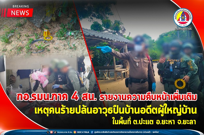 ทั้งนี้ กองอำนวยการรักษาความมั่นคงภายในภาค 4 ส่วนหน้า ขอความร่วมมือพี่น้องประชาชนในพื้นที่ หากผู้ใดพบเบาะแส หรือพบวัตถุต้องสงสัย แจ้งเบาะแสได้ที่หมายเลขโทรศัพท์สายตรง แม่ทัพภาคที่ 4 / ผู้อำนวยการรักษาความมั่นคงภายในภาค 4 โทร 061-1732999 หรือเบอร์สายด่วน กอ.รมน.ภาค 4 สน. 1341 และหน่วยเฉพาะกิจในพื้นที่ได้ตลอด 24 ชั่วโมง