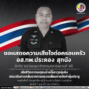 - อาสาสมัครทหารพราน มะกอเส อุมา ถูกยิงบริเวณต้นขาซ้ายได้รับบาดเจ็บ เข้ารักษาตัวโรงพยาบาลนราธิวาส